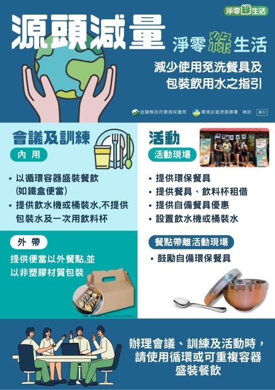 請機關及學校配合落實推動廢棄物源頭減量政策,減少資源消耗,帶動民眾一起落實「自備、重複、少用」的環保觀念,在購買餐食、飲料時,也能自備環保餐具、環保杯或使用店家提供的循環式服務,對環境盡一份心力,使我們的生活更加環保。