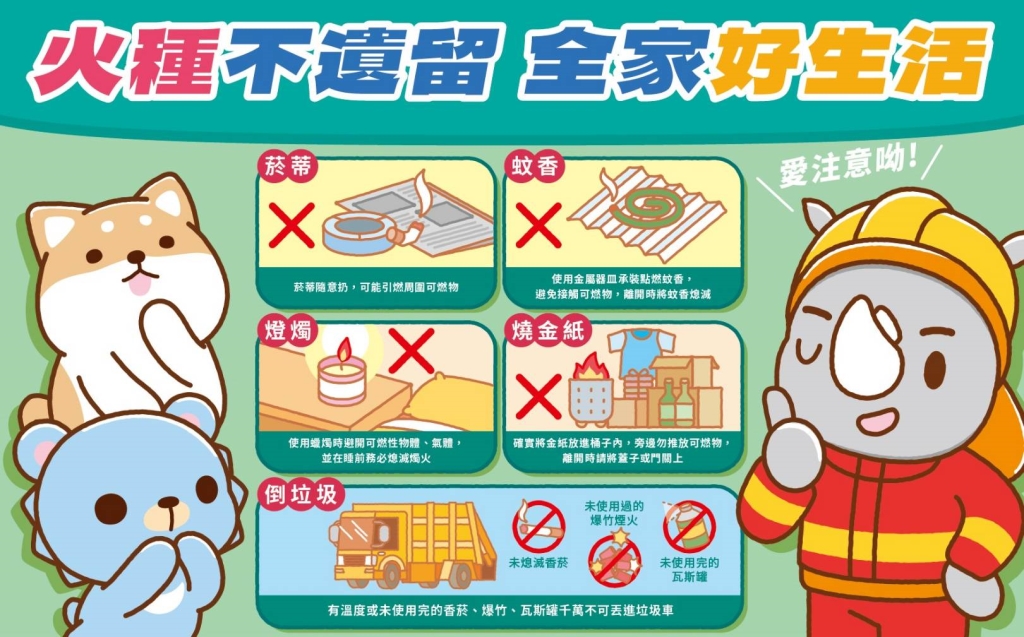 2.住宅用火災警報器-安裝及維護保養。防範電氣火災-5不1沒有。爐火烹調安全-人離火熄。鋰電池使用安全宣導。家庭逃生計畫–1216原則。