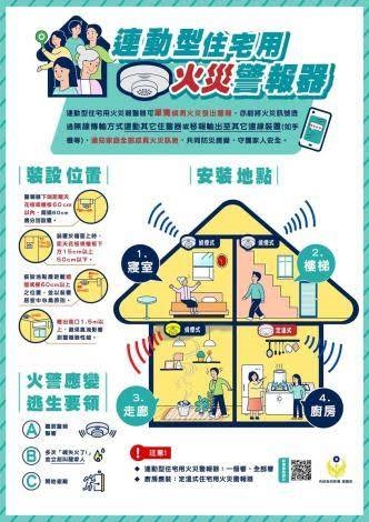 6.因應高齡者或行動不便者建立協助機制,並將連動型住警器納入各式宣導內容,並針對有避難弱者之家庭協調鄉(鎮、市)公所、村(里)長強化宣導住宅之臥室、廚房、客廳、走廊、樓梯等各獨立空間皆應安裝住警器及推廣裝設連動型住警器。